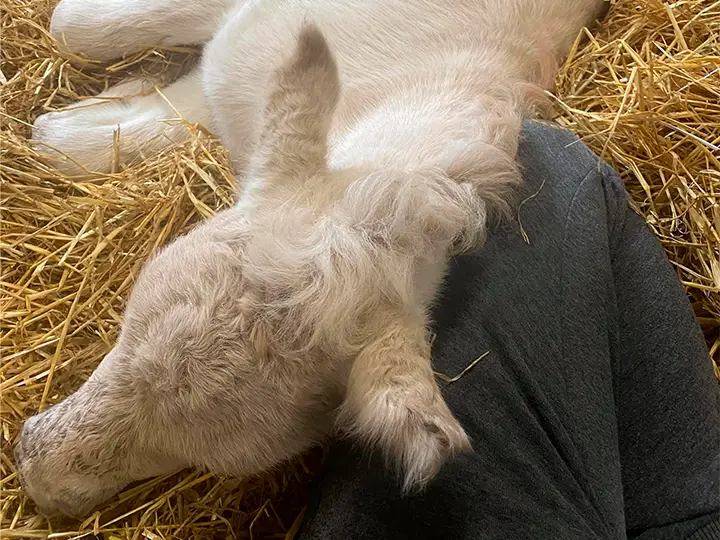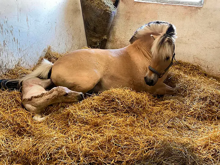 Kl. 19 ville jeg gå ud for at ride et par heste, men kunne se at hun havde lagt sig i løsdriftsskuret og var i gang med at fole. Det var jo ikke lige planen at hun skulle fole udenfor, så med lidt overtalelse fik jeg hende med ind på stald og så gik folingen ellers sin gang i boksen.