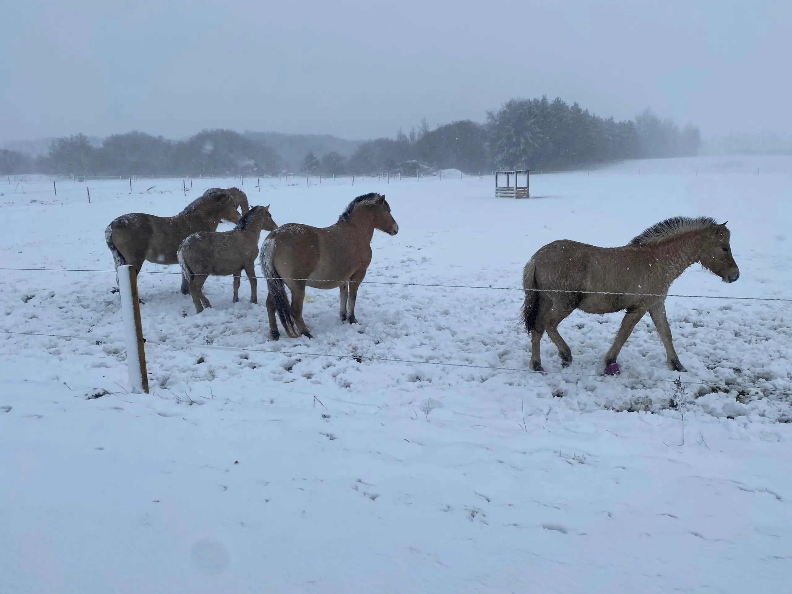 Jeg har 5 heste, der står på løsdrift. Det er 3 avlshopper og 2 føl, alle af racen fjordhest.
